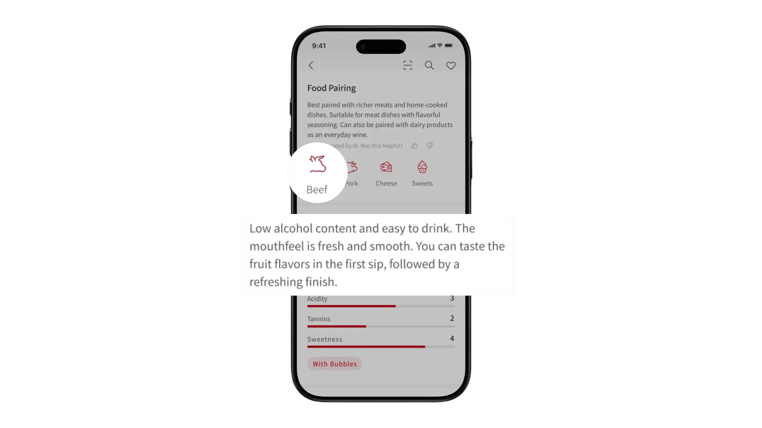 I combined three elements to make wine expertise accessible: numerical scales (Acidity: 3) for quick comparison, everyday descriptions ('fresh and smooth' instead of 'medium-bodied'), and food pairing icons (beef, cheese, sweets) that relate to real dining experiences