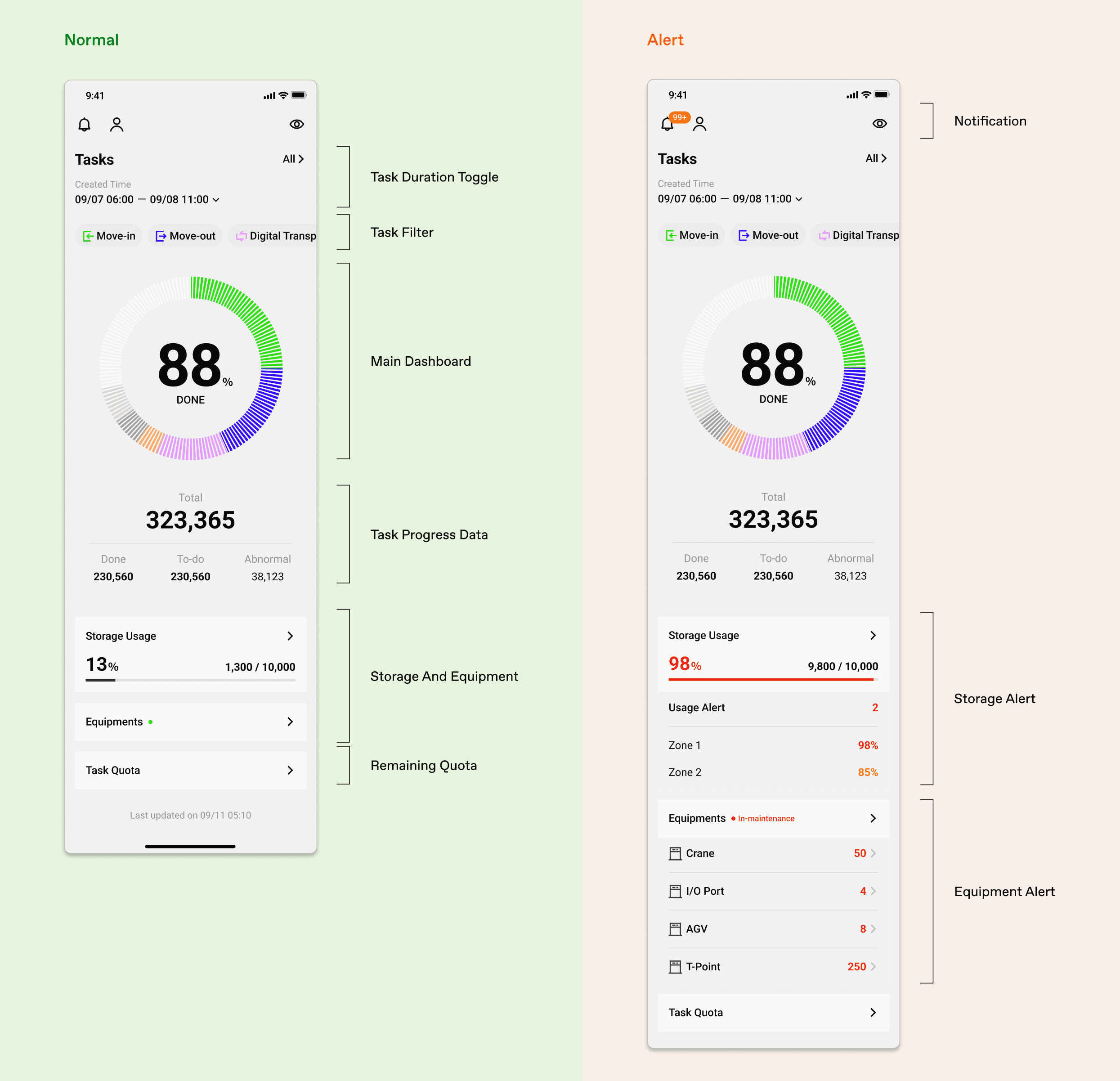 Task progress, storage capacity, and alerts matter to everyone. That became the homepage elements.