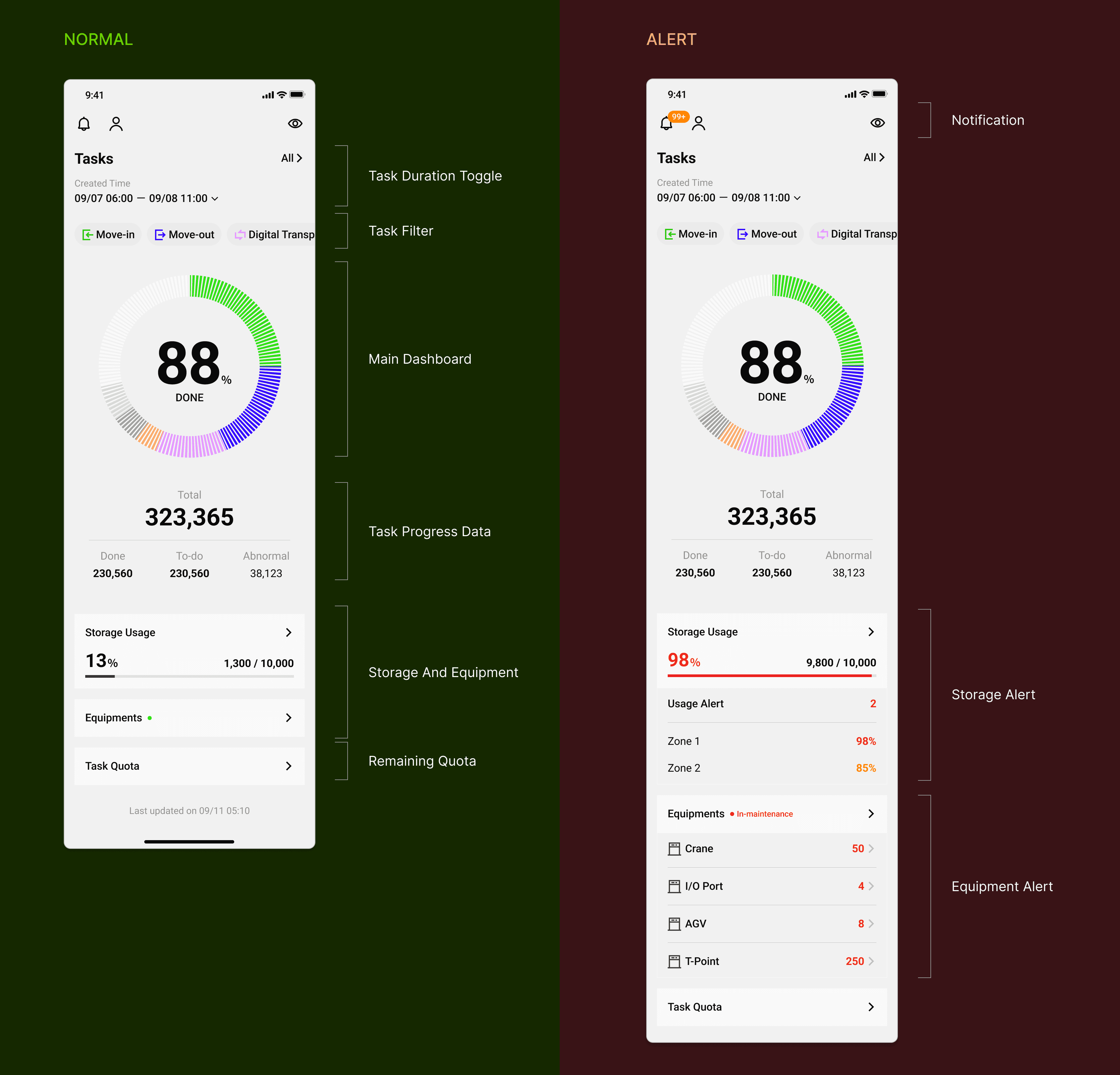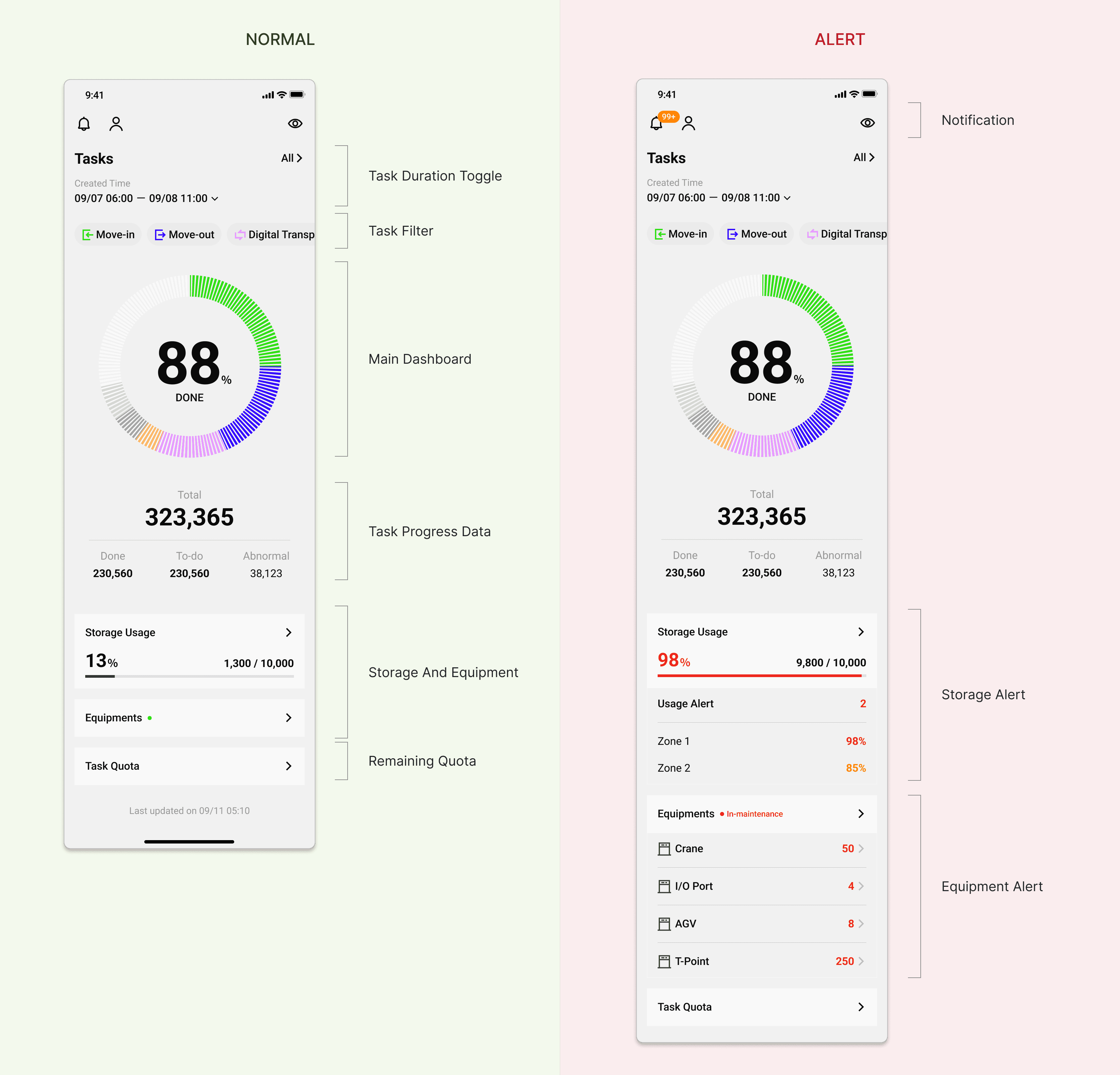 Through interview, I found urgent information matters to all teams: alerts first, progress second, storage third, analytics last. Staff can now see task progress, storage capacity, and equipment alerts instantly.